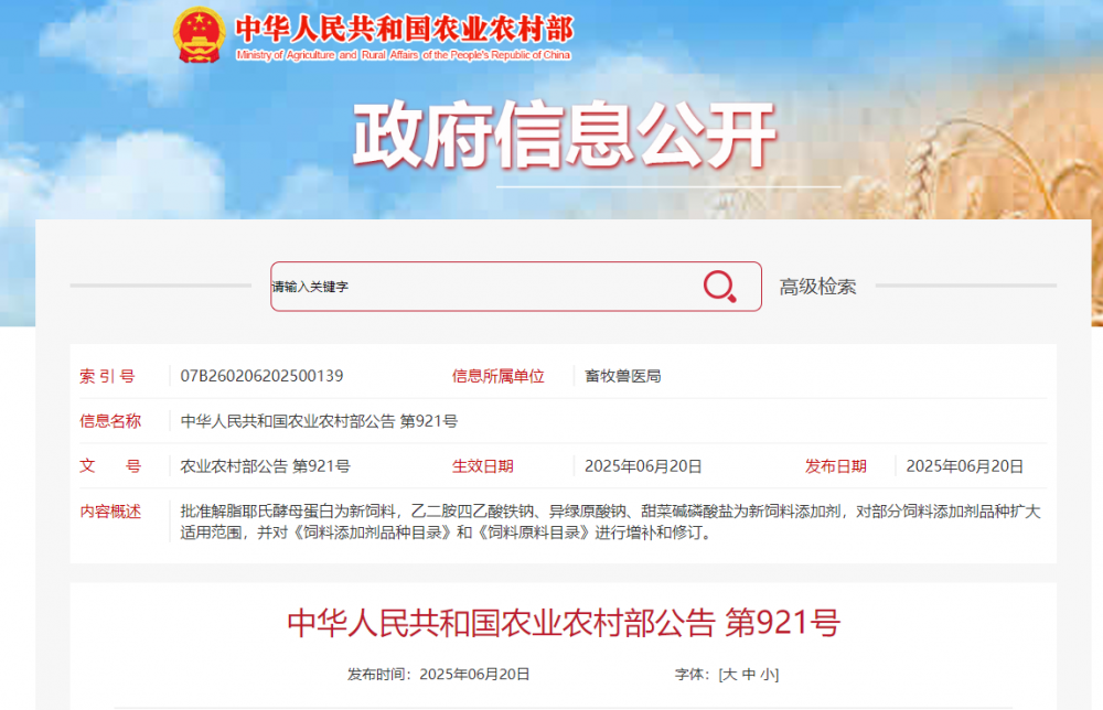 依据《饲料和饲料添加剂管理条例》和《新饲料和新饲料添加剂管理办法》,农业农村部组织全国饲料评审委员会对申请人提交的新饲料和新饲料添加剂产品申请材料进行了评审,决定批准解脂耶氏酵母蛋白为新饲料,乙二胺四乙酸铁钠、异绿原酸钠、甜菜碱磷酸盐为新饲料添加剂,批准d–泛酸钙(产自重组大肠杆菌pt06/cctcc m 2023146)生产工艺发生重大变化,对部分饲料添加剂品种扩大适用范围,并对《饲料添加剂品种目录》和《饲料原料目录》进行增补和修订。现将有关事项公告如下。
