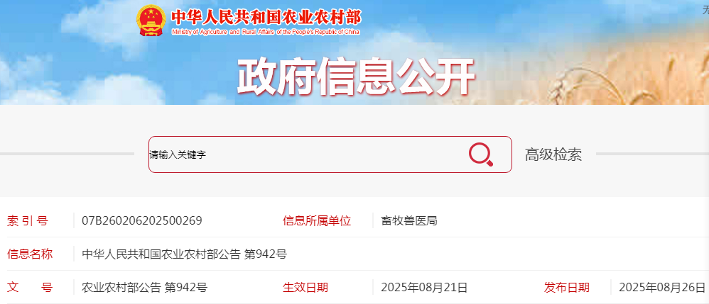 中华人民共和国农业农村部公告 第942号