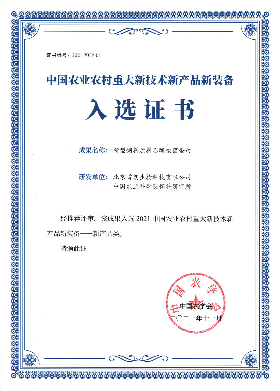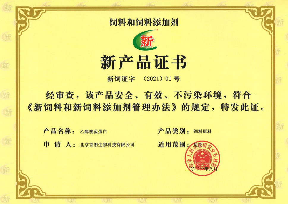 新产品获证单位北京首朗生物科技有限公司制定了乙醇梭菌蛋白行业标准,产品已应用于鱼类、仔猪和肉禽配合饲料中,形成较好的推广效果,产生良好的社会效益。该产品于2021年入选中国农业农村重大新技术新产品新装备——新产品类;2023年获颁北京市新技术新产品证书;2025年入选国家首批生物制造标志性产品名单。