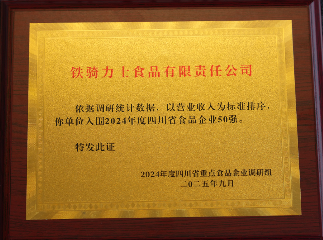 就在不久前,《2024年度四川省50家重点食品企业发展研究报告》也正式发布。该报告由四川省食品饮料产业协会联合相关商协会,组织有关高校专家,基于《四川省农产品精深加工产业链建圈强链五个细分领域三年行动方案》的相关部署要求,聚焦食品产业龙头企业开展调研形成。铁骑力士凭借卓越的研发能力、出色的市场表现和对产品品质的不懈追求,以排名第一身份入选2024年度四川省食品企业50强(不含白酒)。企业综合实力在四川省食品行业中持续领先。