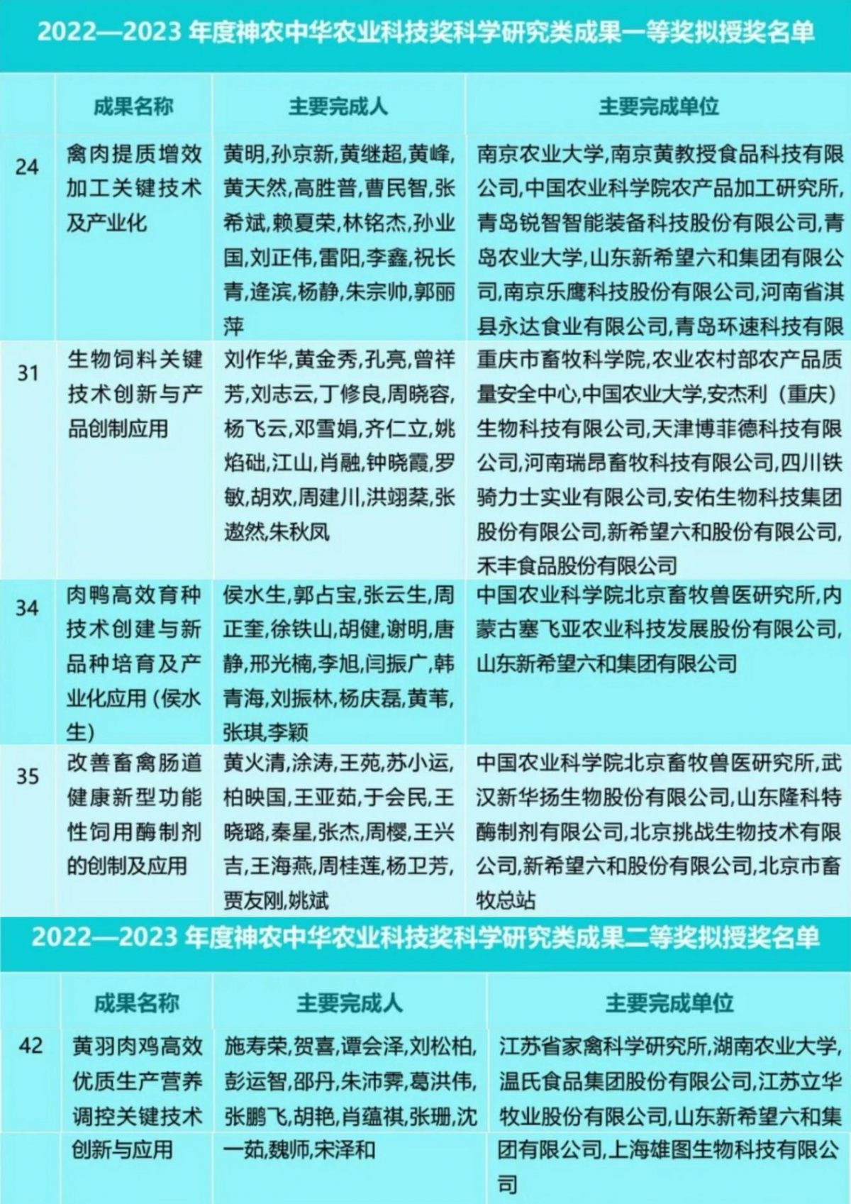 根据《2022-2023年度神农中华农业科技奖获奖名录》,获奖项目包括科学研究类成果一等奖40项、二等奖50项、三等奖59项,优秀创新团队奖25个。根据拟授奖名单,新希望六和及旗下公司参与的《禽肉提质增效加工关键技术及产业化》、《生物饲料关键技术创新与产品创制应用》、《肉鸭高效育种技术创新与新品种培育及产业化应用》、《改善畜禽肠道健康新型功能性饲用酶制剂的创新及应用》4项科研成果获得一等奖,参与的《黄羽肉鸡高效优质生产营养调控关键技术创新与应用》科研成果获得二等奖。