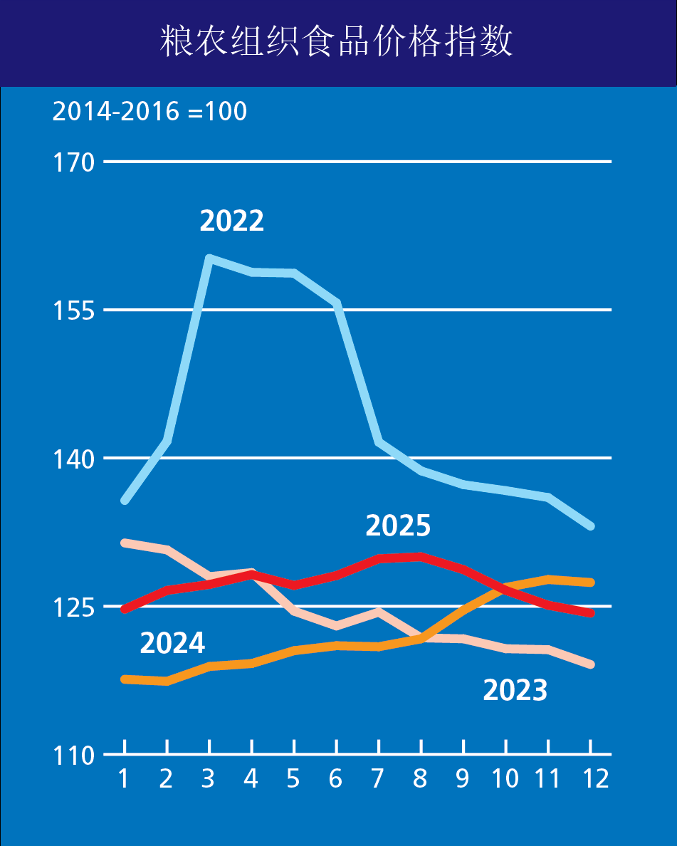 粮农组织食品价格指数是衡量一揽子食品类商品国际价格月度变化的尺度。2025年12月,粮农组织食品价格指数平均为 124.3点,较11月下降0.6%,较上年同期下降2.3%。