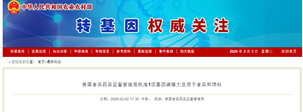 2026年1月13日美国食品药品监督管理局(fda)批准了1项基因编辑大豆vpm-0007用于食品和饲料。该基因编辑大豆由inari公司研发,通过删去一个或多个基因的编码序列或非编码序列,以提高产量,并增加种子数量和大小。