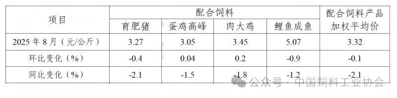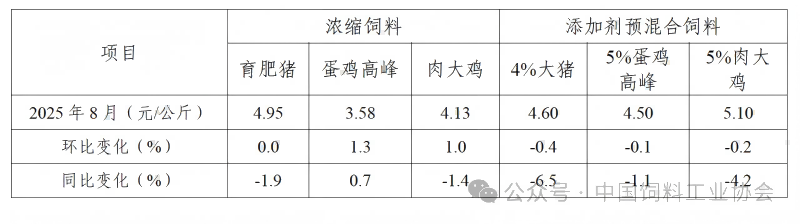 表3 2025年8月饲料企业浓缩饲料和添加剂预混合饲料平均价格