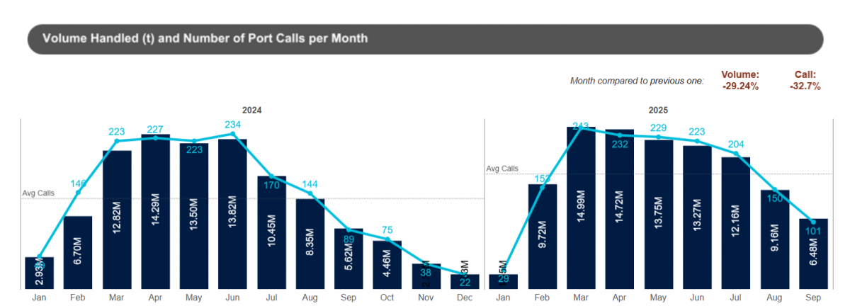 下图显示了 2024 年 1 月至 2025 年 9 月巴西大豆的出口情况。