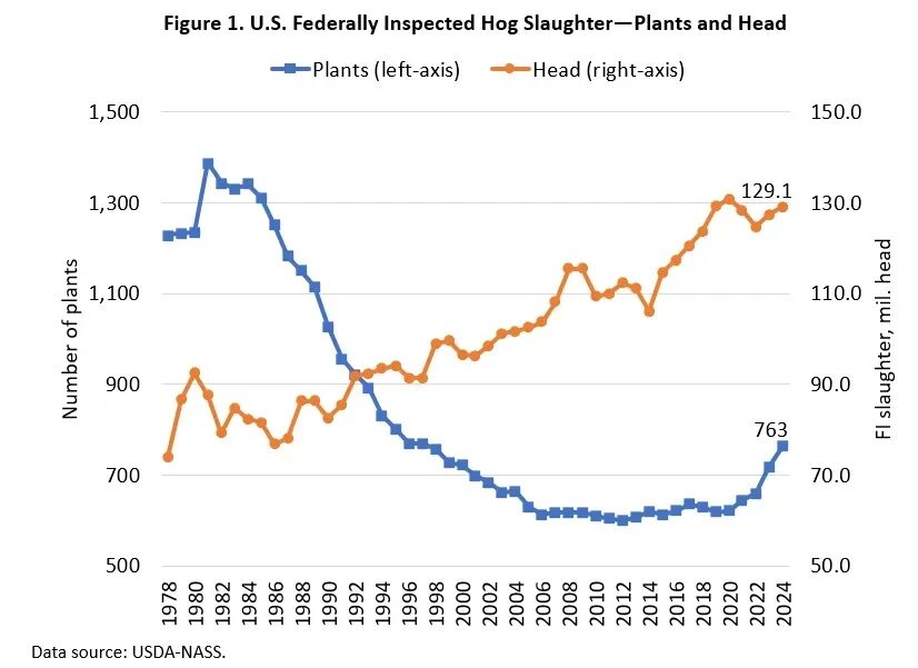 1982 年至 2002 年,美国联邦检验(fi)生猪屠宰厂数量稳步下降。在之后的 20 年里,这一数量保持相对稳定。随后,屠宰厂数量出现回升,从 2022 年的 659 家增至 2024 年的 763 家(见图 1)。为何会出现反弹?联邦政府一直致力于扩大中小型肉类加工设施规模,提供的补贴可用于以下方面: