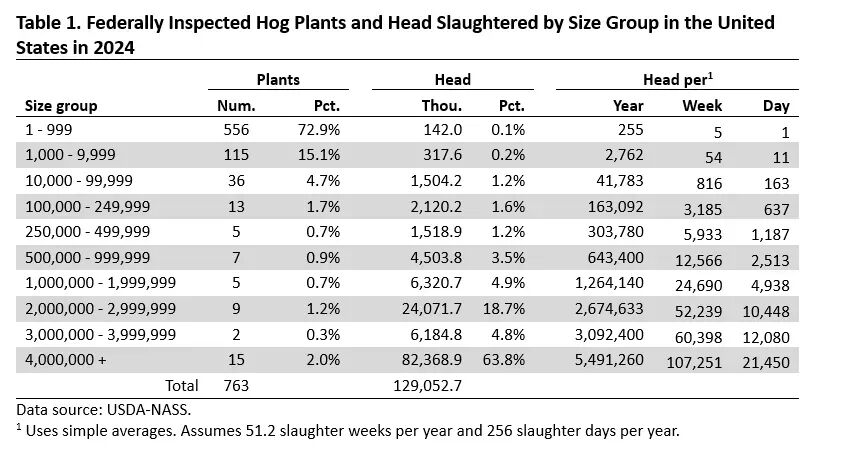 美国农业部国家农业统计局(nass)会统计前一年各规模联邦检验屠宰厂的数量及屠宰头数,并于每年 4 月在《牲畜屠宰年度摘要》中发布相关数据。美国 99% 以上的生猪屠宰都在联邦检验工厂进行。工厂关闭不一定会导致生猪总屠宰产能下降,生猪可被运往其他有剩余产能的工厂。此外,若新增工厂规模较小,也未必能提升整体产能。