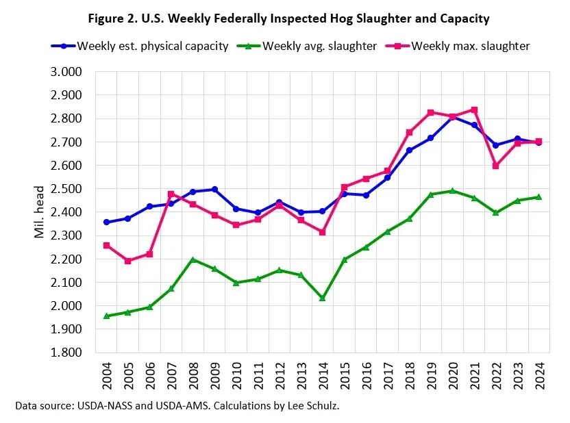 实际产能的计算可能比运营产能更简单。前者在一定程度上是固定的,而后者则是动态变化的。若要计算联邦检验生猪屠宰厂的最大实际年产能,可采用国家农业统计局在《牲畜屠宰年度摘要》中公布的各规模工厂产能上限(其中最大规模工厂的产能上限设定为 500 万头)来估算各工厂的产能。将各规模工厂的产能上限乘以对应规模的工厂数量,再将结果相加,即可得到最大实际年产能。用该年产能除以全年屠宰周数(将每月屠宰周数相加得出),便能得到每周的最大实际屠宰产能。2024 年,美国生猪每周最大实际屠宰产能为 269.6392 万头(见图 2),高于 2024 年每周 246.4735 万头的平均屠宰量,每周最大屠宰量则为 270.22 万头。