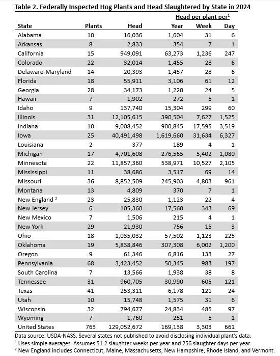 另一方面,2024 年爱荷华州的 25 家工厂共屠宰生猪 4049.1498 万头,平均每家工厂年屠宰量为 161.966 万头,按周计算为 3.1634 万头 / 周,按日计算则为 6327 头 / 日。当然,宾夕法尼亚州和爱荷华州的部分工厂屠宰量会高于这些简单平均值,部分工厂则会低于该值。