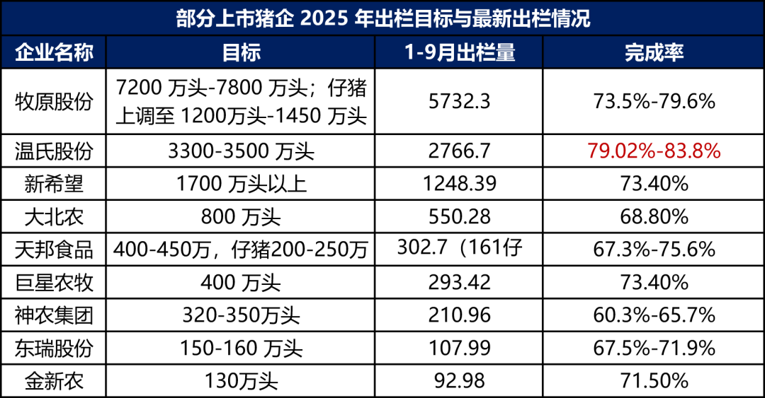从上市猪企的年度出栏目标与实际计划完成情况来看,1-9月份除温氏股份进度偏快,其他规模企业进度较正常节奏均偏慢1.5%-10%不等,最低达15%。企业四季度出栏压力增大,月度出栏计划或阶梯式增长。
