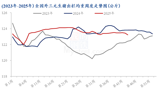 10月中上旬猪价快速深跌,商品猪出栏均重跟进小降。前期养殖端亏损面积扩大,养殖场降重出栏意向提升;其次,气温降后南方大体重猪源成交有所加快,规模场大猪存栏减少;再次二次育肥入场,同步带动部分规模场超计划走量,导致月内生猪出栏均重由123.5公斤降至123.2公斤。但目前来看,近期生猪体重段区间价差明显,规模场继续降重意向有限。养户多有压栏增重情绪,叠加前期二次育肥大面积入场,后续气温持续下降后大猪成交速度加快,生猪出栏均重易涨难降。