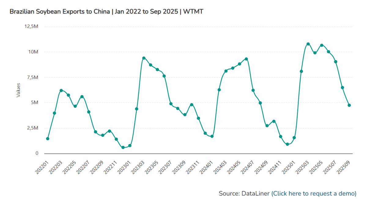 下图显示了自 2022 年 1 月以来巴西对华大豆出口历史数据。