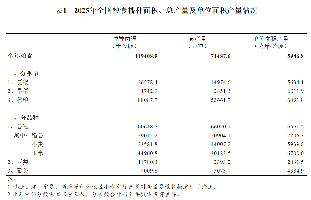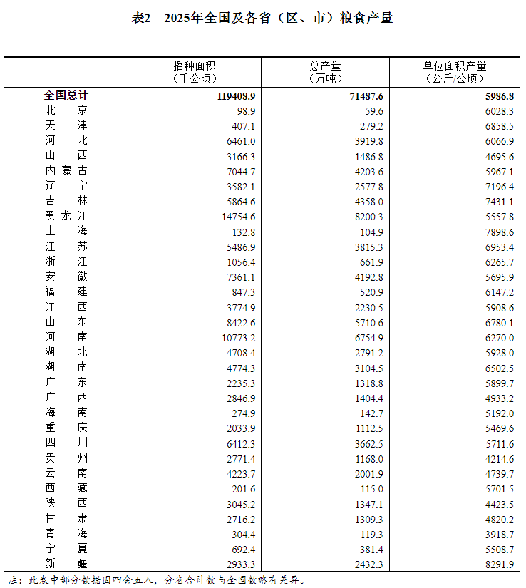 根据对全国31个省(区、市)的调查,2025年全国粮食播种面积、单位面积产量和总产量分别如下: