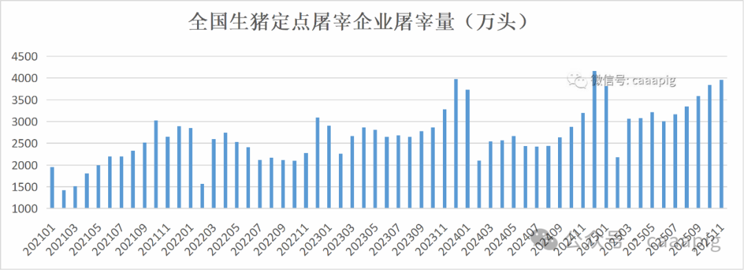 1、2025年11月份生猪定点屠宰企业屠宰量3957万头,环比增长3.2%,同比增长17.4%。