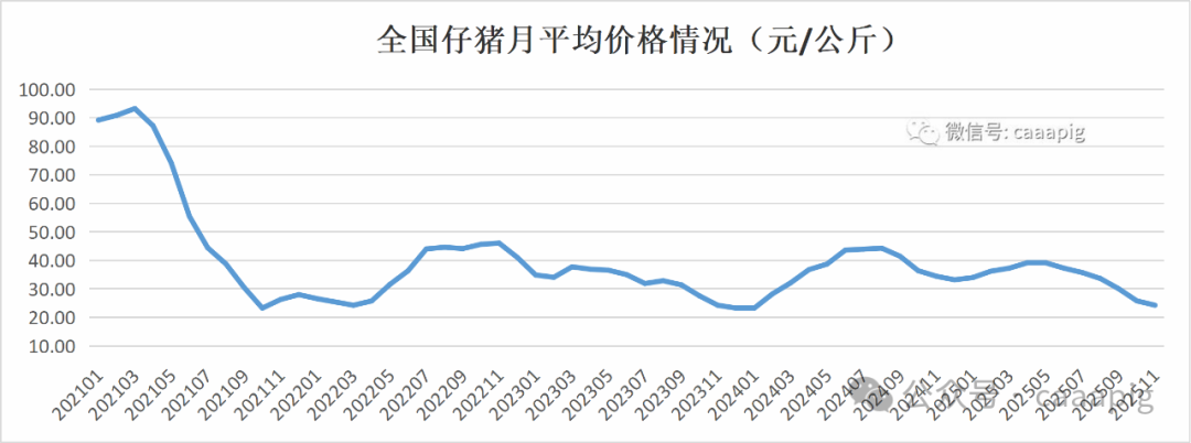 2、2025年11月份全国仔猪价格24.25元/公斤,环比下跌6.0%,同比下跌29.5%。