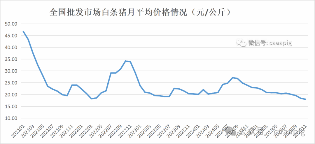 4、2025年11月份全国批发市场白条猪价格17.97元/公斤,环比下跌2.4%,同比下跌24.9%