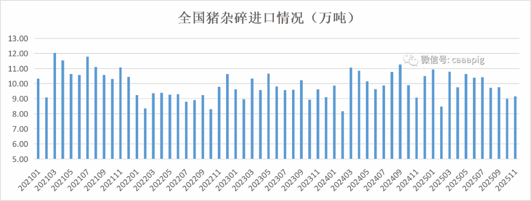 2、2025年11月进口猪杂碎9.16万吨,环比增长1.9%,同比增长1.0%。