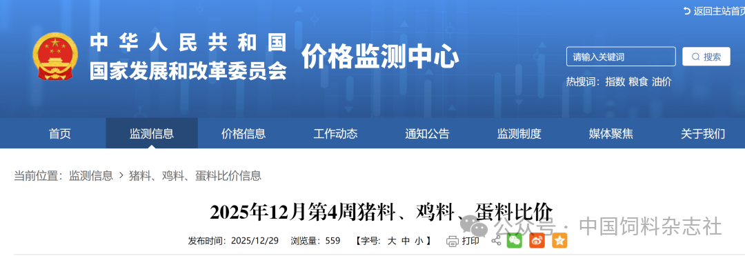 2025年12月29日,国家发改委公布2025年12月第4周猪料、鸡料、蛋料比价。