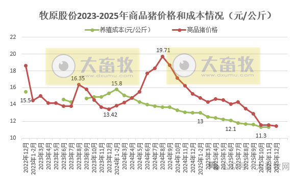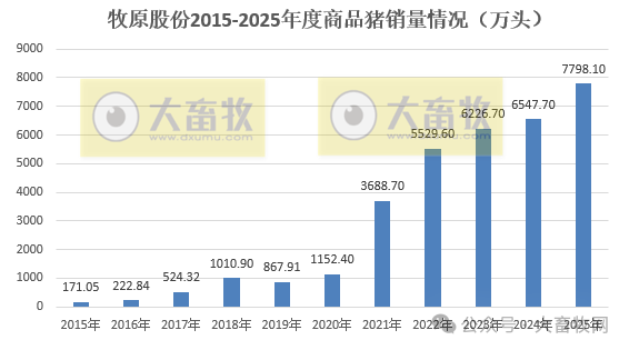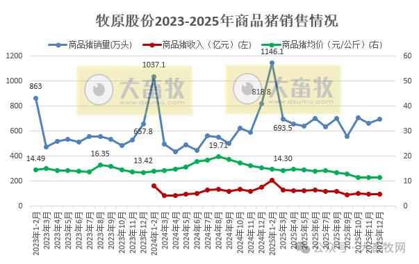 seline;color:#222222;text-indent:0px;background-color:#ffffff;" class="js_darkmode__2 js_darkmode__text__0"> 大畜牧综合,近日,牧原股份披露2025年12月生猪销售情况,公司12月商品猪销量和收入环比增长同比减少,12月猪价跌至差不多近7年最低;全年商品猪销量约7800万头,比2024年增加1250万头,全年收入突破1300亿元;12月内部销售量创历史新高,首次突破300万头,全年销量达到2850多万头;能繁母猪存栏为323.2万头,比上年末减少28万头。
