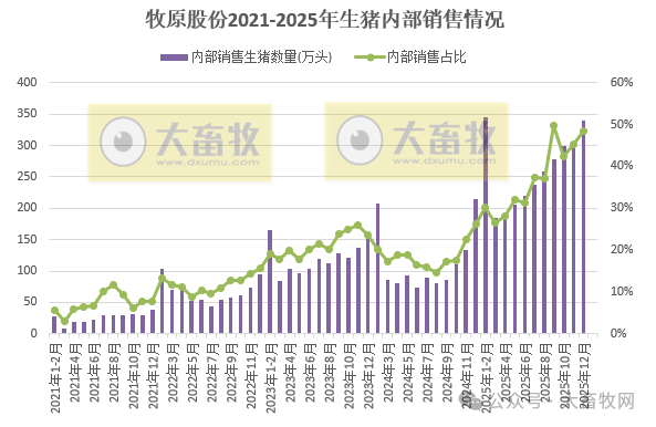 seline;color:#222222;text-indent:0px;background-color:#ffffff;" class="js_darkmode__25 js_darkmode__text__57"> 其中,2025年12月,向全资子公司牧原肉食品有限公司及其子公司合计销售商品猪数量为339.0万头,环比增长13.34%,同比增长57.38%,连续12个月同比增长,且单月销量创历史新高,首次突破300万头,占商品猪销量的比率为48.57%。