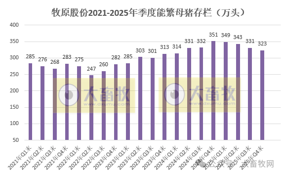 同时,牧原股份表示,截至2025年12月末,公司能繁母猪存栏为323.2万头,为近7个季度最低,与上年末最高的351.2万头减少28万头。