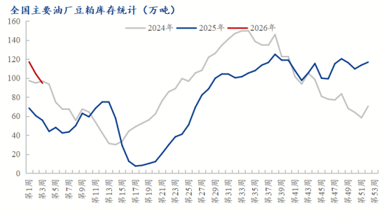 据mysteel对国内主要油厂调查数据显示:2026年第3周,全国主要油厂大豆及豆粕库存均下降。其中大豆库存687.33万吨,较上周减少25.79万吨,减幅3.62%,这表明油厂的原料正在被快速消化,而豆粕库存94.72万吨,较上周减少9.68万吨,减幅9.27%,豆粕库存降至百万吨以下,下降速度较快。与此同时,全国油厂开机率维持在55%左右的偏低水平。低开机率一方面是部分油厂因缺豆或检修主动调控,另一方面也是当前大豆库存消耗下的被动选择。产出减少与库存下降形成共振,从源头上削弱了市场的供应压力。
