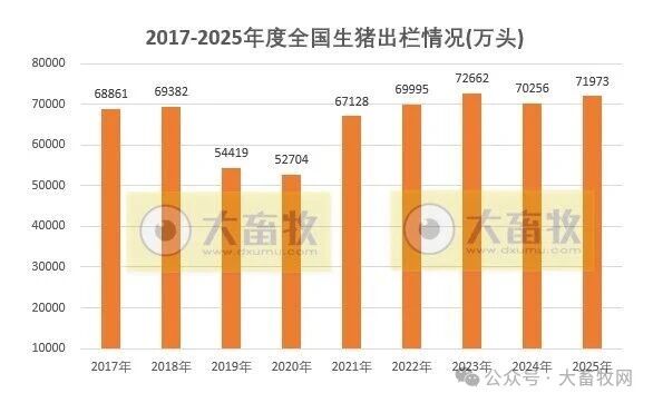 2025年,全国生猪出栏为71973万头,比上年增加1716万头,增幅为2.4%,连续3年突破7亿头,自2017年以来,仅仅低于2023年。