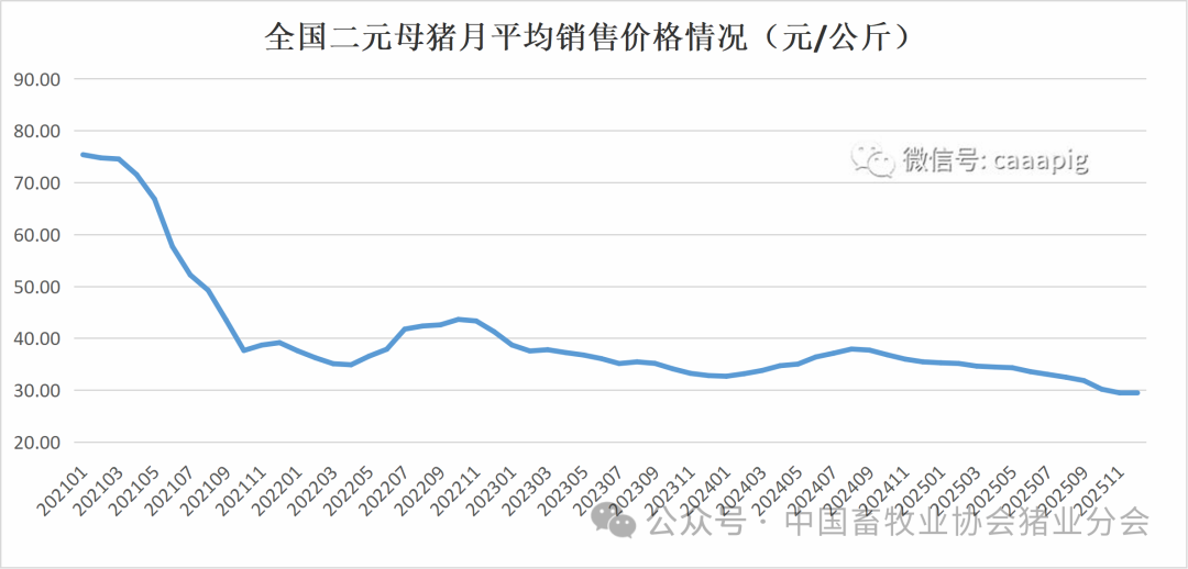 1、2025年12月份全国二元母猪销售价格29.42元/公斤,环比下跌0.3%,同比下跌17.1%。