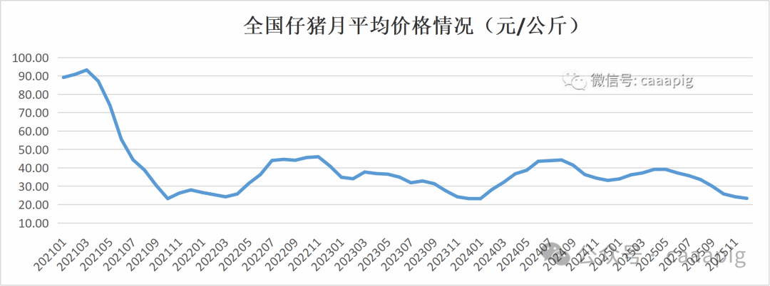 2、2025年12月份全国仔猪价格23.39元/公斤,环比下跌3.5%,同比下跌29.5%。