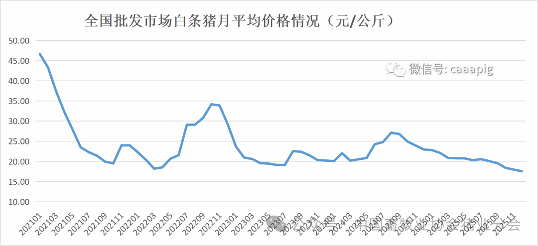 3、2025年12月份全国生猪出场价格11.99元/公斤,环比下跌2.8%,同比下跌27.2%。