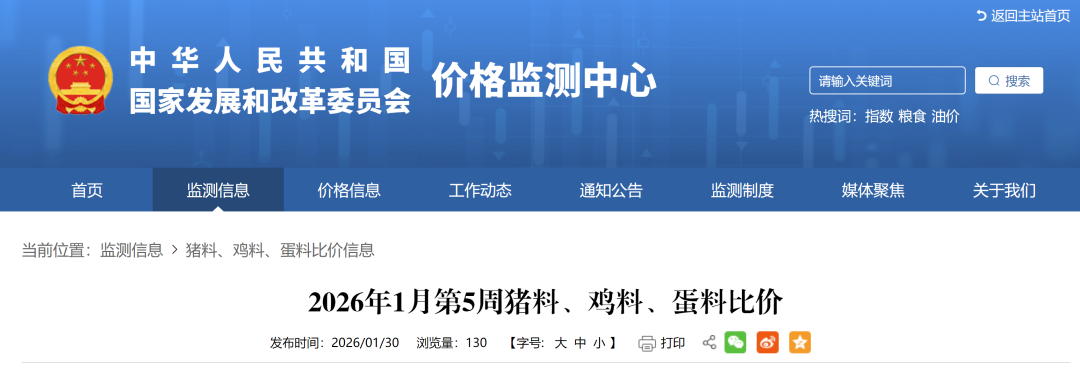 1月30日,国家发改委发布1月第5周猪料、鸡料、蛋料比价。