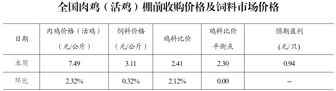 本周全国鸡料比价为2.41,环比上涨2.12%。按目前价格及成本推算,未来肉鸡养殖预期盈利0.94元/只。