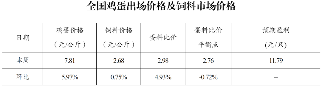 本周全国蛋料比价为2.98,环比上涨4.93%。按目前价格及成本推算,未来蛋鸡养殖每只盈利11.79元。