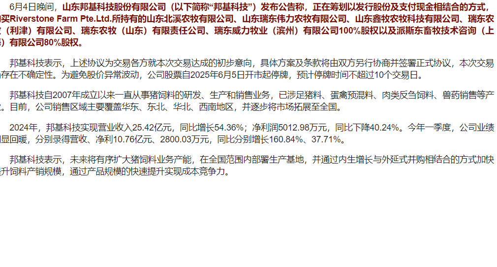 6月4日晚间,山东邦基科技股份有限公司(以下简称“邦基科技”)发布公告称,正在筹划以发行股份及支付现金相结合的方式,购买riverstone farm pte.ltd.所持有的山东北溪农牧有限公司、山东瑞东伟力农牧有限公司、山东鑫牧农牧科技有限公司、瑞东农牧(利津)有限公司、瑞东农牧(山东)有限责任公司、瑞东威力牧业(滨州)有限公司100%股权以及派斯东畜牧技术咨询(上海)有限公司80%股权。