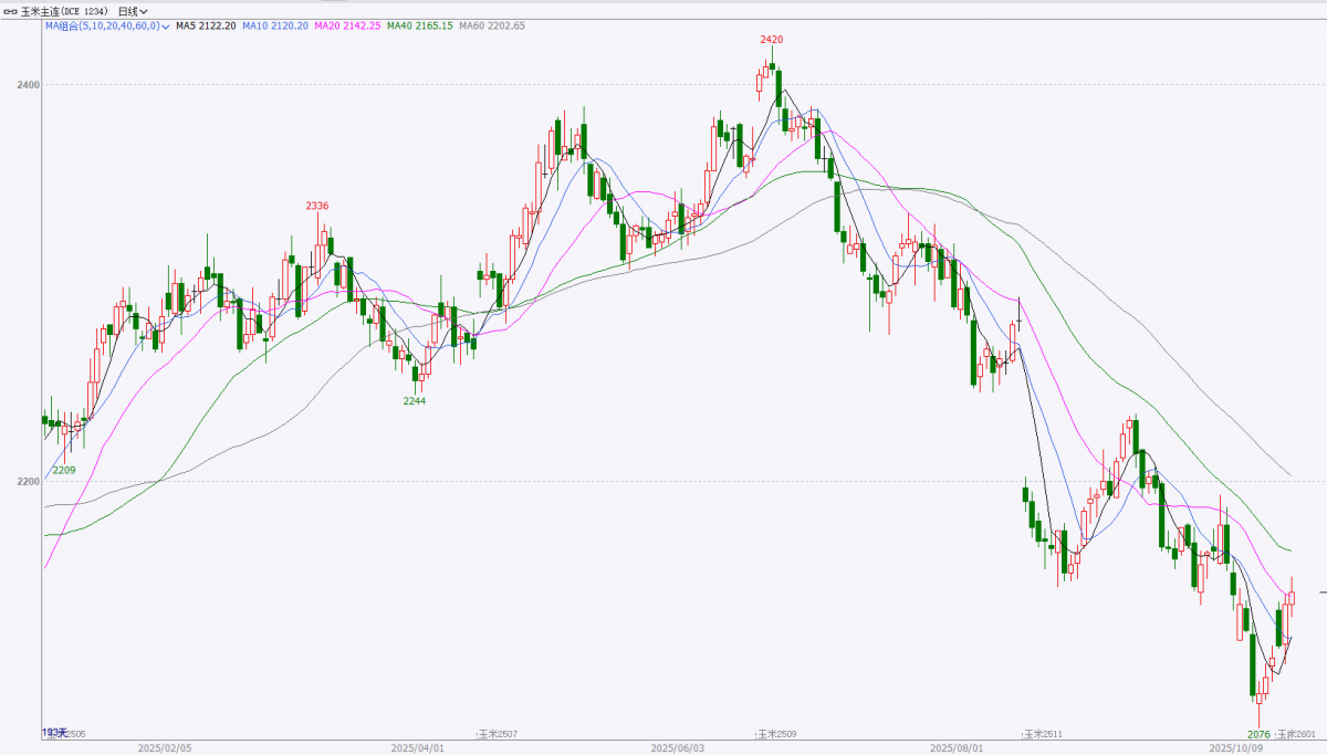 进入本周,玉米盘面延续前几天的反弹趋势,再度走强上涨。周一玉米新晋主力合约2601,由跌转升,实现阳包阴,而且首次站上二十均线。周二主力合约继续大幅上涨,最高升至2152元,收盘于2144元,创下本月最高数值。