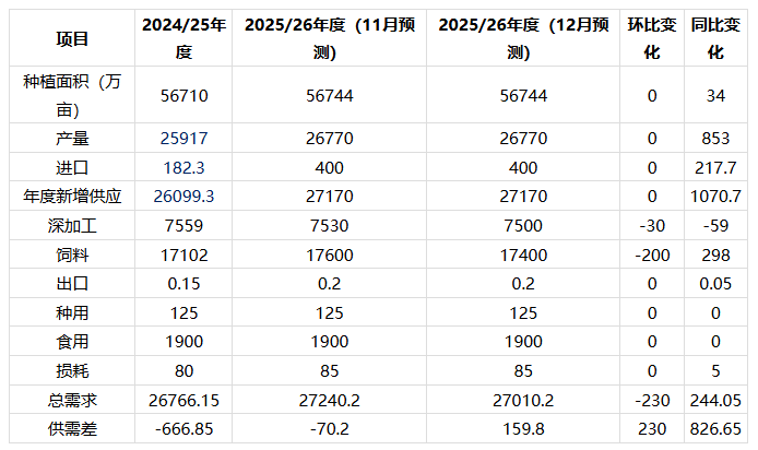 【导语】2025/26年度供需平衡表在12月的预期中,年度总供应量较11月预期持平。需求方面,饲料行业玉米消费量与深加工行业玉米消费量在12月的预期中较上月均有减少。根据本月预估的2025/26年度供需关系,相比2024/25年度趋于宽松,但依旧呈现相对紧平衡状态。