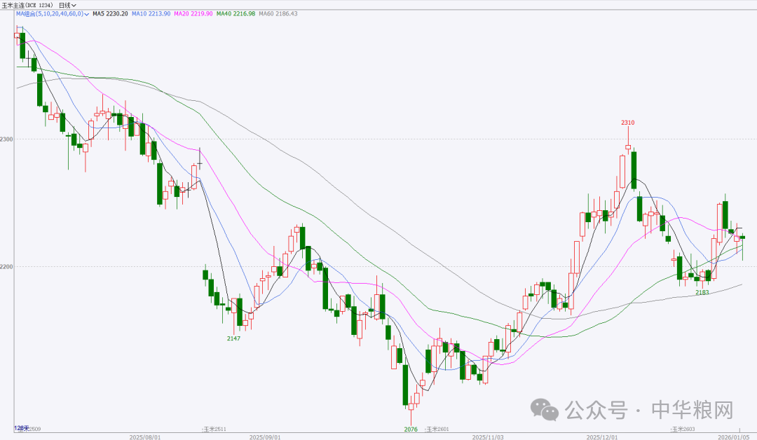 元旦后首周,玉米期货呈震荡走势。1月6日主力c2603合约高开低走,下探2205元后回升,最终微跌1元,收于近两周低点。从技术上看,日线盘中一度跌破40日均线,收于5日均线之下,暂获40日均线支撑;周线目前与5周均线基本持平,已下穿10周均线,上方仍面临60周均线压力。短期走势震荡偏弱。