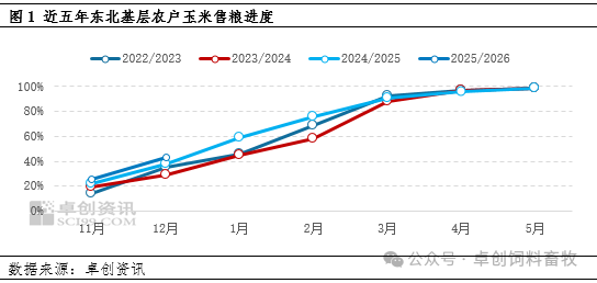 截至2025年12月31日,东北产区平均售粮进度为43%,较上年同期偏快4个百分点。2025/26年度新粮上市后,基层潮粮价格较上年同期高0.10元/斤左右,种植利润可观,初期基层农户售粮积极性尚可,东北产区整体进度稍快,但进入12月份由于基层农户惜售情绪不改,要价坚挺,多地烘干塔停收潮粮,整体售粮进度提速缓慢。后续2026年1月份基层售粮进度预判来看,预计农户意向有所增强,但心理价格依旧偏高。