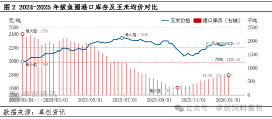 基层售粮增速缓慢直接导致港口刚需发运的情况下玉米库存明显低于去年同期,卓创资讯监测数据显示,截至2026年1月2日,北方六港周度玉米库存195.9万吨,去年同期为587.1万吨,2024年同期为223万吨,整体本年度北港库存量明显低于2025年同期,但与2024年同期相差不大。以鲅鱼圈为例,至2026年1月2日,鲅鱼圈港口库存73.51万吨,去年同期为225.1万吨。