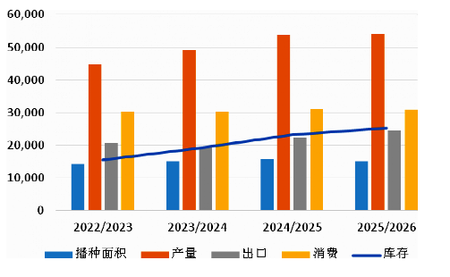 尽管美小麦种植面积处于低位,但是结转库存接近10亿蒲式耳,只有库存被消化掉,美麦价格才能摆脱弱势。中长期而言,导致美麦减产的拉尼娜不太可能发生,如果2026/2027年度种植面积和单产维持不变,那么,美麦结转库存可能超过10亿蒲式耳,并维持当前价格区间。